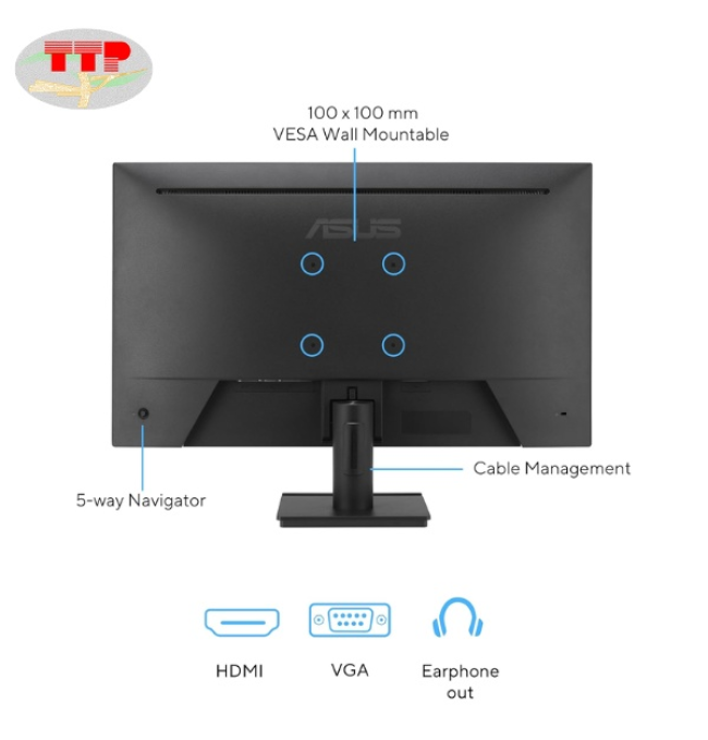 Màn hình Asus VA279HG 27 inch có cổng HDMI 1.4 hỗ trợ tín hiệu số ổn định, phù hợp với các thiết bị hiện đại, trong khi đó VGA vẫn đáp ứng tốt nhu cầu kết nối với máy tính văn phòng đời trước như máy tính để bàn, laptop hoặc các hệ thống cũ. Ngoài ra, màn hình văn phòng Asus VA279HG còn có đầu cắm tai nghe tiện lợi, dễ dàng kết nối thiết bị âm thanh cá nhân.