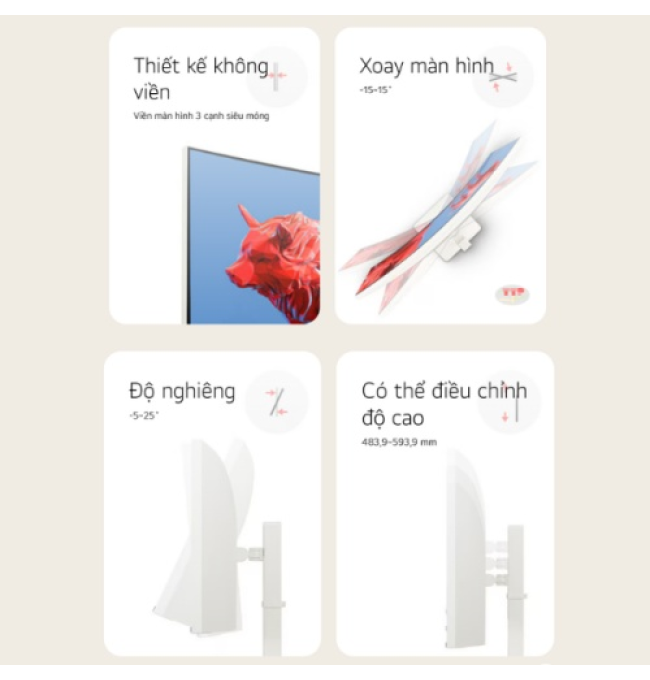 Màn hình LCD LG 38WR85QC-W.ATV có khả năng điều chỉnh linh hoạt, đảm bảo luôn chuẩn với góc nhìn của bạn. Thiết bị có thể nghiêng từ -5° đến 25° để giảm chói sáng, nâng hoặc hạ độ cao trong khoảng 0 - 110 mm để vừa tầm mắt và xoay từ -15° đến 15° để dễ dàng chia sẻ nội dung với đồng nghiệp, bạn bè hay đồng đội. Nhờ có thiết kế tiện ích, bạn có thể giảm áp lực cho cổ và lưng khi sử dụng lâu, để bạn tập trung hơn vào thông tin được hiển thị trên màn hình.