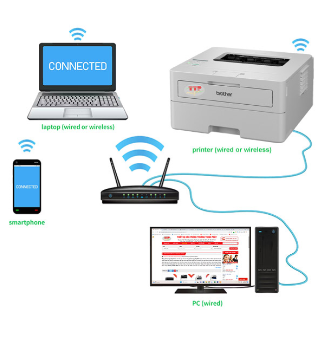 Các thiết bị trong văn phòng có thể kết nối trực tiếp với máy in laser Brother HL-B2180Dw với tính năng Wi-Fi Direct. Tính năng Wi-Fi Direct của Brother HL-B2180Dw cho phép người dùng máy tính hay điện thoại di động kết nối trực tiếp như một điểm truy cập mạng.