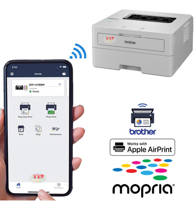 Với máy in Brother HL-B2180Dw giờ đây bạn có thể thoải mái in ảnh và tài liệu từ các thiết bị di động của bạn nhờ các ứng dụng AirPrint, Mopria, Mobile Connect trên cả 2 nền tảng IOS và Android.