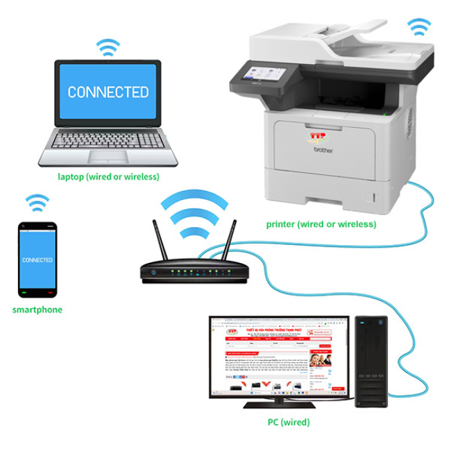 Máy in Brother MFC-L5915Dw có thể kết nối với mạng Lan văn phòng với 2 chuẩn có dây và không dây WiFi hỗ trợ cả 2 băng tầng 2.4GHz và 5.0 GHz, bạn có thể dễ dàng chia sẻ việc in ấn giữa những người dùng có kết nối chung điểm truy cập, chung lớp mạng với máy in Brother 5915Dw.