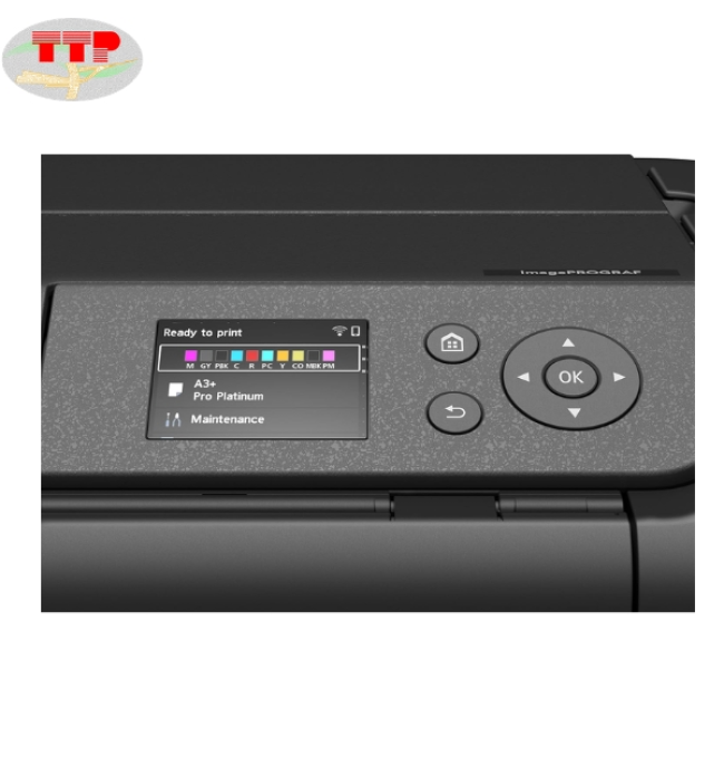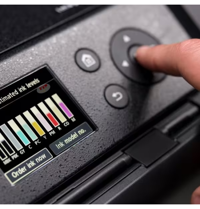 Màn hình của máy in phun Canon PRO-310 là dạng cảm ứng màu 3 inch, hiển thị đầy đủ mức mực của cả 10 màu cùng lúc. Bạn có thể dễ dàng biết chính xác từng màu còn bao nhiêu % mà không cần mở máy tính. Khi sắp hết mực, máy sẽ báo rõ màu nào cần thay. Đồng thời, việc thiết lập kết nối Wi-Fi hay in từ điện thoại cũng được thực hiện nhanh trên máy.